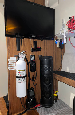 I disconnected the TV Antenna which tapped power behind the USB port in the v-berth. Then I tapped power for the Soundbar there. I mounted it vertically. It connects to the TV with RCA cables but does require a ground loop isolator (found in our Affiliate link under "upgrades").